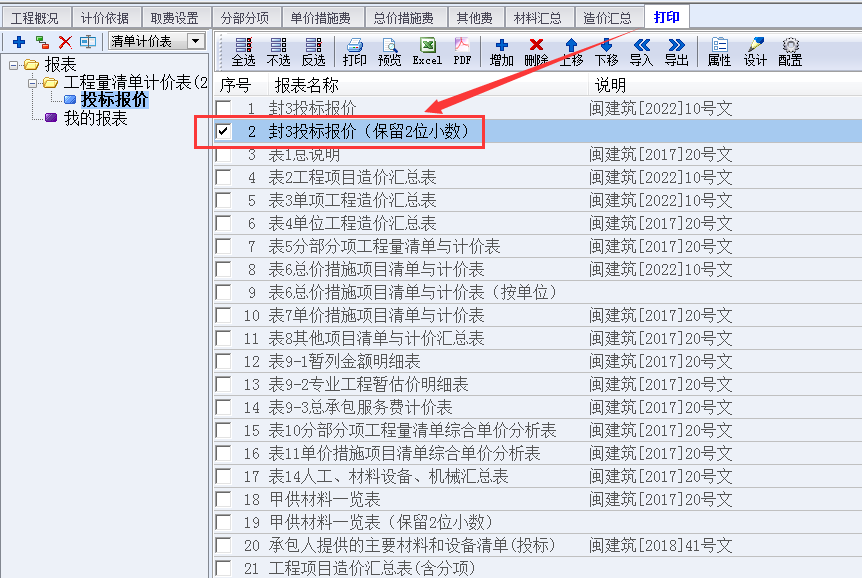 在打印界面,选择封3投标报价(保留2位小数)导出即可。