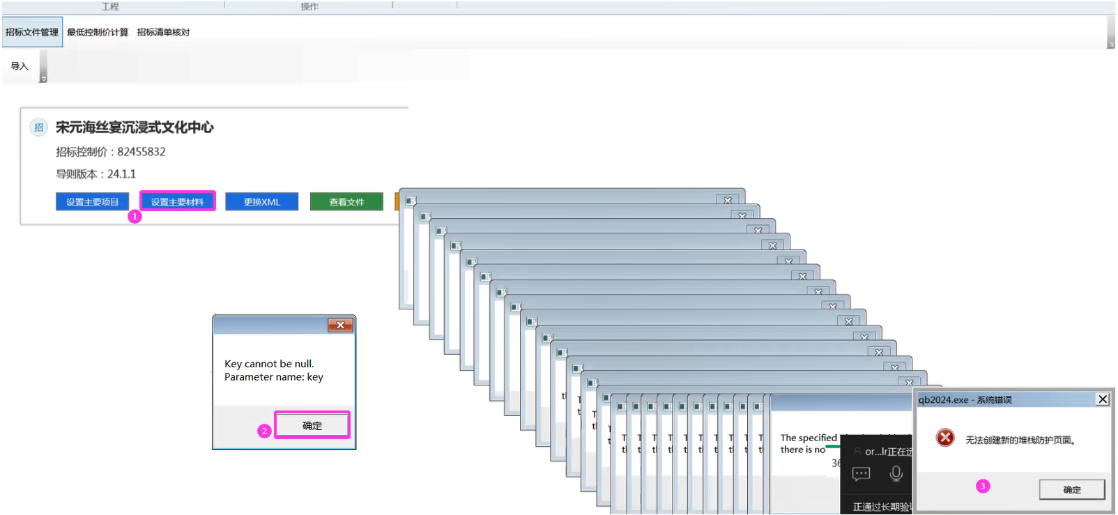 清标2024软件,点击【设置主要材料】时,弹窗提示:Key cannot be null.Parameter name: key. 无法创建新的堆栈防护页面。